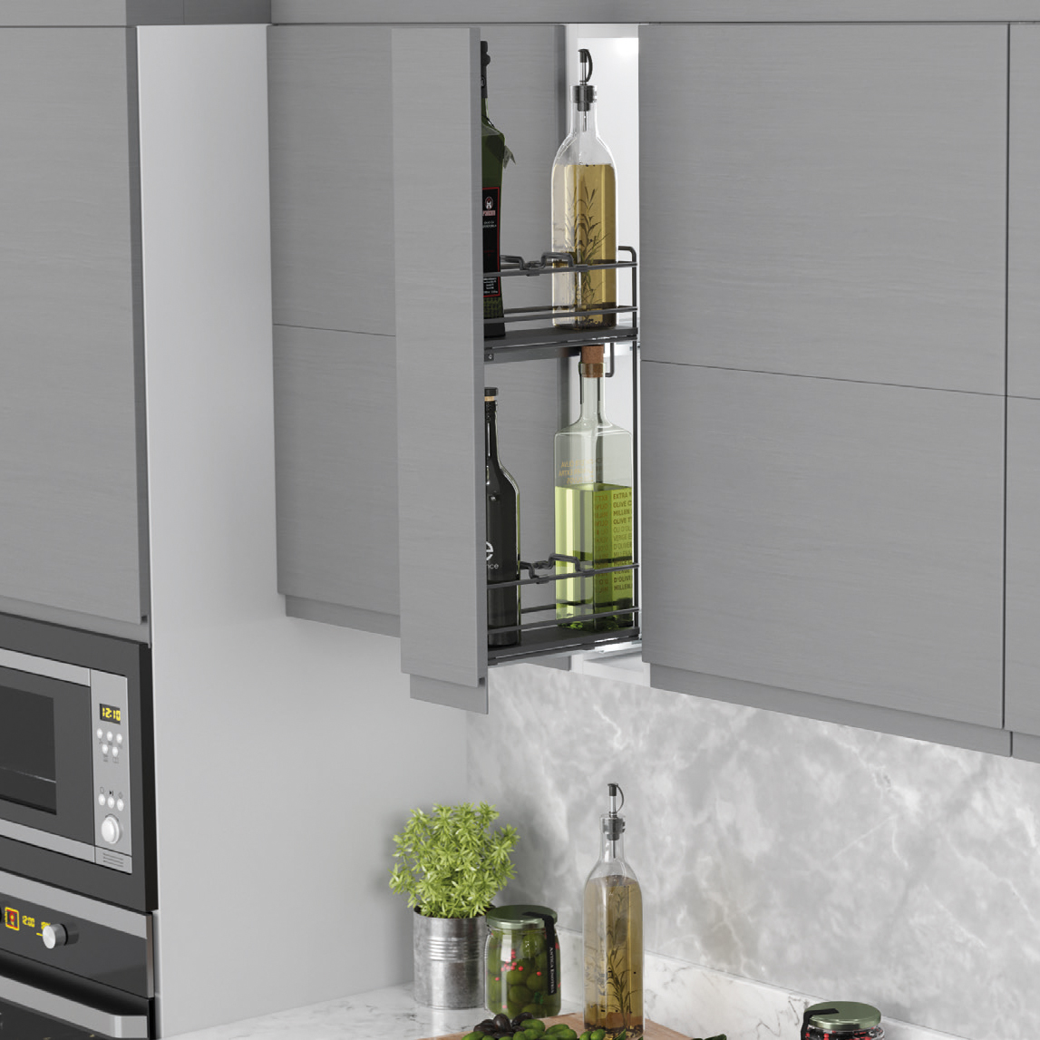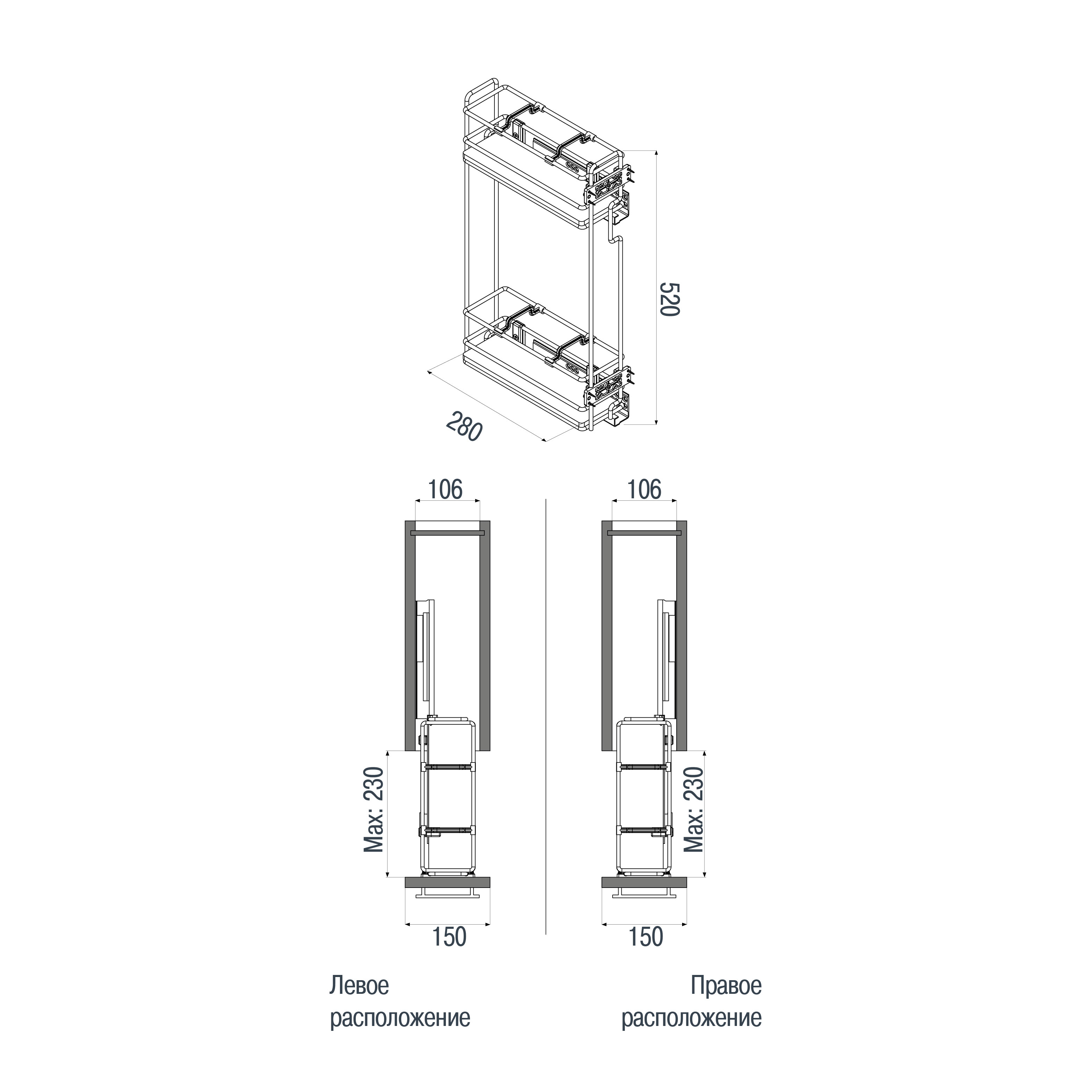 2х-ур. реш.емкость 150мм левая в верх.шкаф L300мм,напр.Blum, дно-ЛДСП, креп/фас.,разд/бут.,антрацит